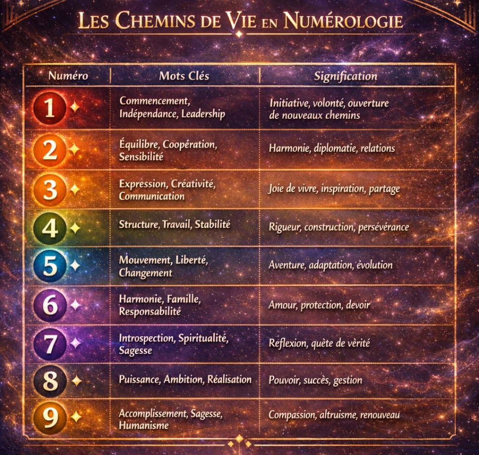 👉 L’analyse du chemin de vie 🧭 permet d’entrevoir certaines tendances naturelles, des talents, mais aussi des défis qui peuvent accompagner une personne tout au long de son parcours. De son côté, l’étude des cycles de vie ⏳ et des années personnelles aide à mieux comprendre les périodes d’évolution, de transition ou de construction que chacun peut traverser.