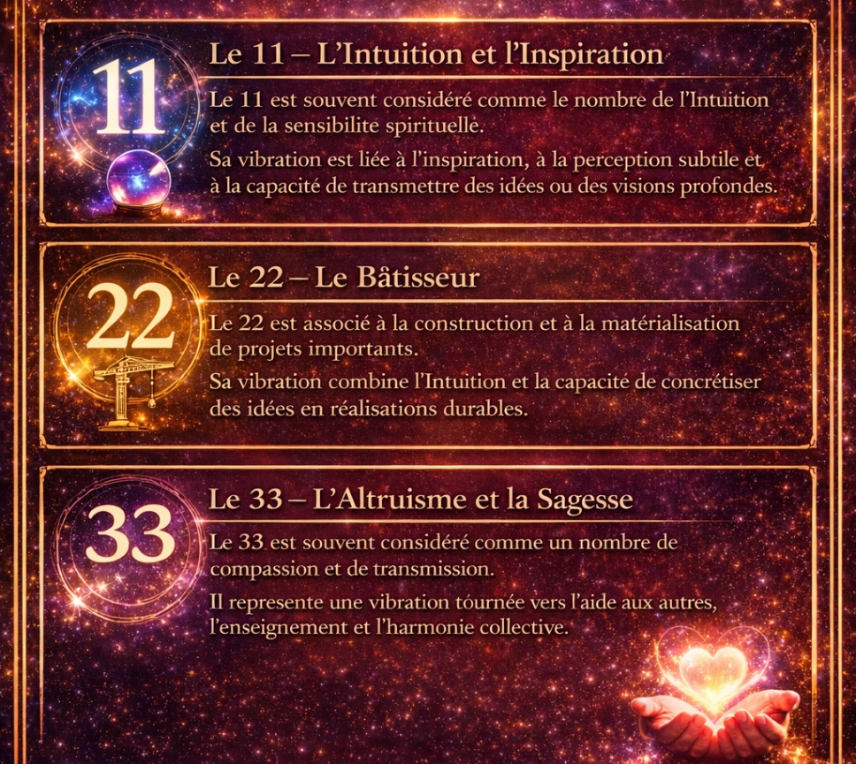 👉 Certains nombres possèdent une vibration plus intense, appelés nombres maîtres, 11, 22, 33.