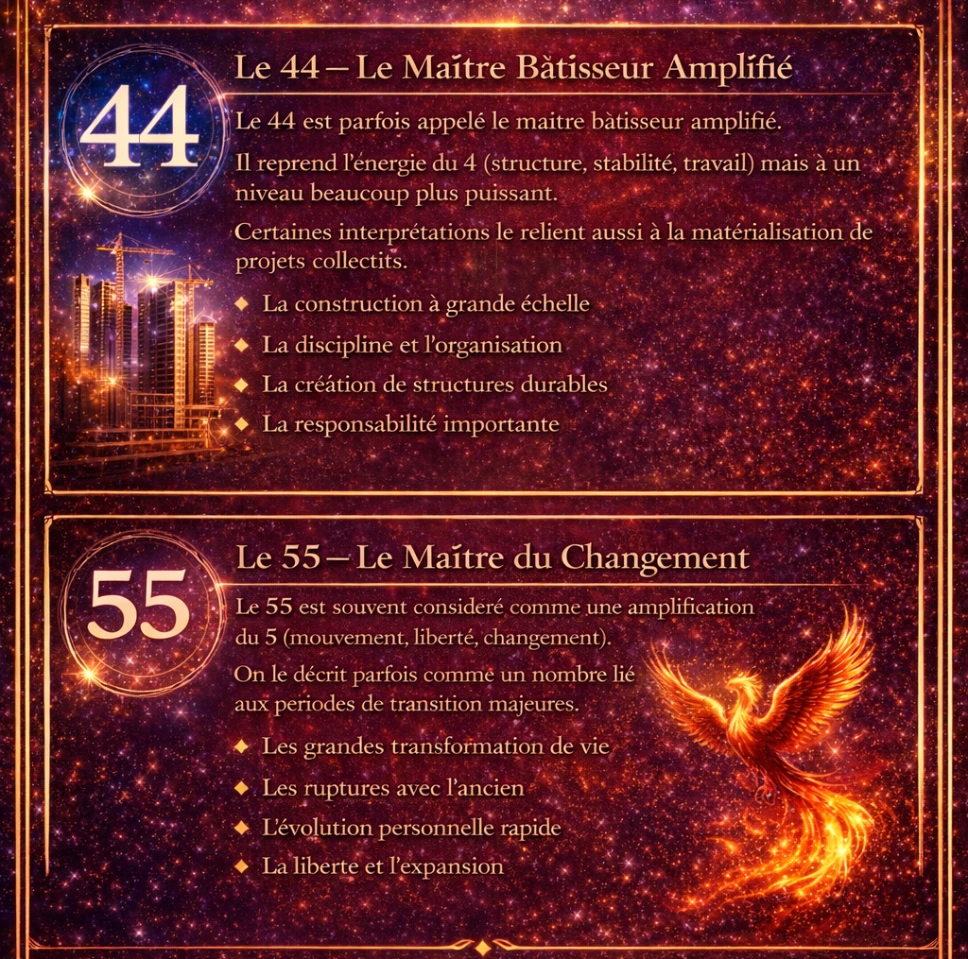 👉 Les nombres 44 et 55 ne sont pas toujours considérés comme des nombres maîtres dans la tradition classique.