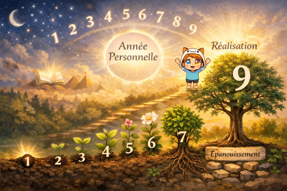 En plus des grands cycles, la numérologie utilise aussi le principe de l’année personnelle, qui se calcule en additionnant le jour et le mois de naissance avec l’année en cours 📅. Ce calcul permet d’identifier la vibration énergétique d’une année précise et les tendances qu’elle peut apporter.